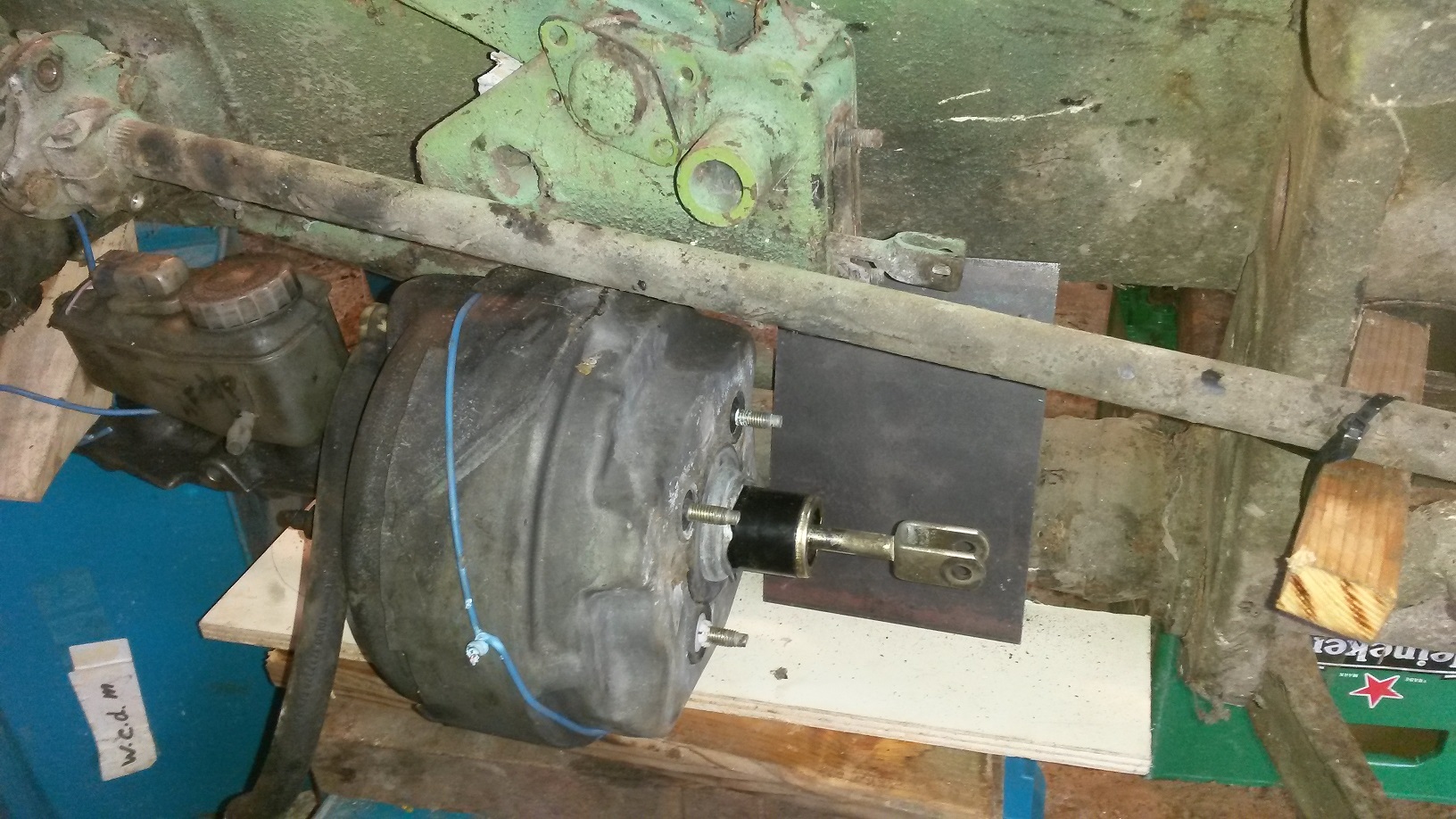 Eerste hobbel was de bediening omdraaien, nu drukt de stift in de hoofdrem cilinder naar achteren en hier was geen plek voor de nieuwe rem dus dat moest de andere kant op.