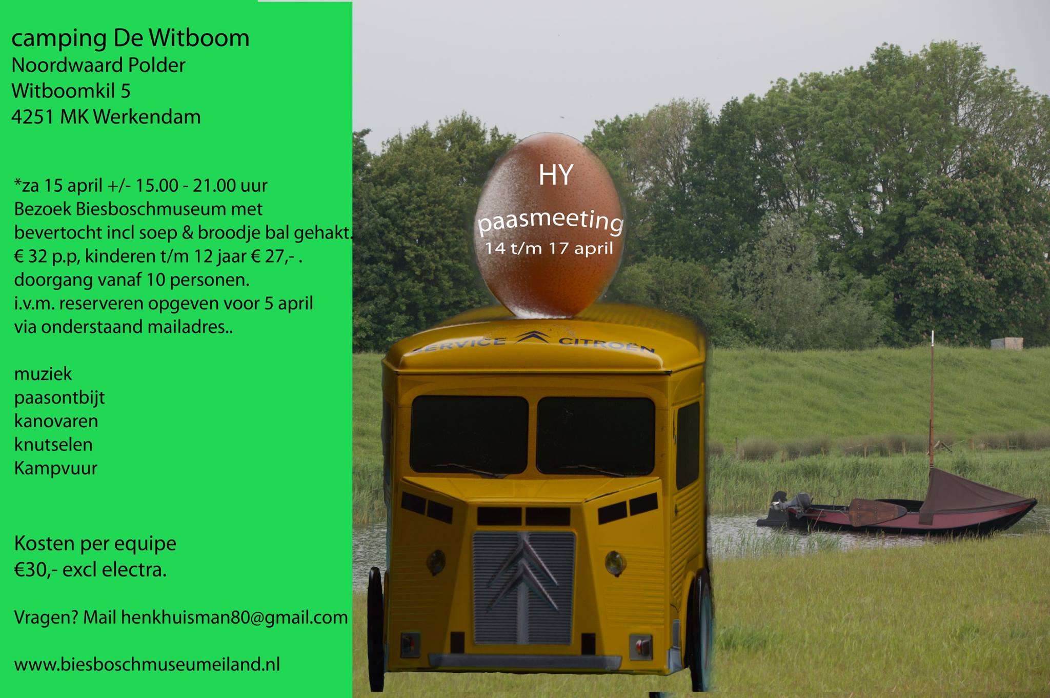 We verzamelen op vrijdag 14 april om een uur of 6 's avonds (18:00uur) bij mini-camping Witboom (adres Witboomkil 5, Werkendam). Van daaruit gaan we de eerste overnachtingsplek zoeken.
