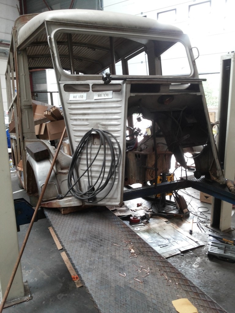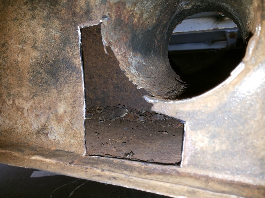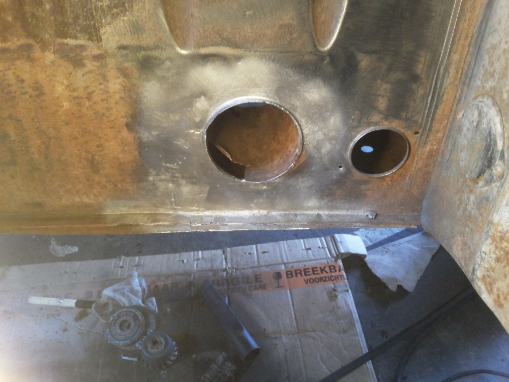 ik ben toevallig juist bezig met herstel van plaatwerk rondom de doorvoer van de uitlaatpijp, zij het op bescheiden schaal. Met paard er (nog) uit is dat inderdaad gemakkelijker. Aanvankelijk had ik het verroeste stuk er uit voldoende uitgesneden, dacht ik , maar bij het lassen vielen er toch gaten in; derhalve is het gat 2x zo groot geworden als op de foto te zien is, opgevuld met een tweede stukje plaat.