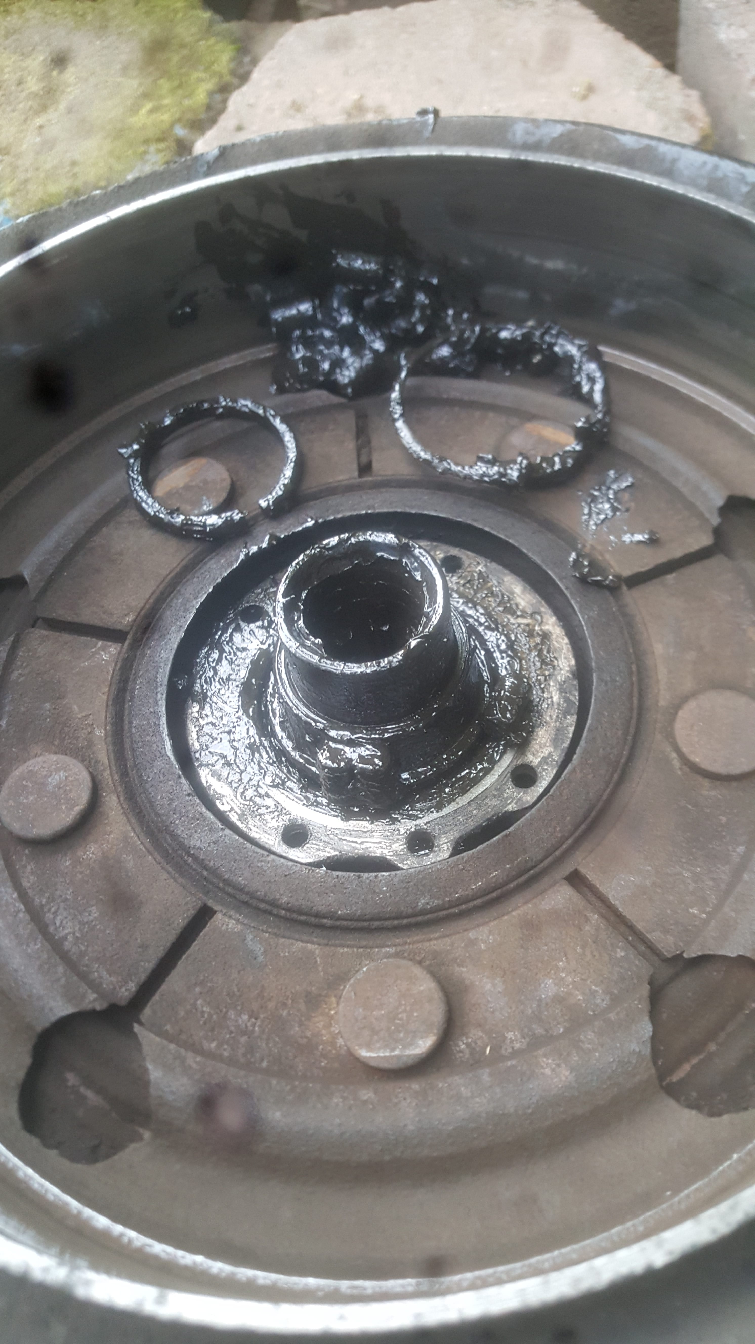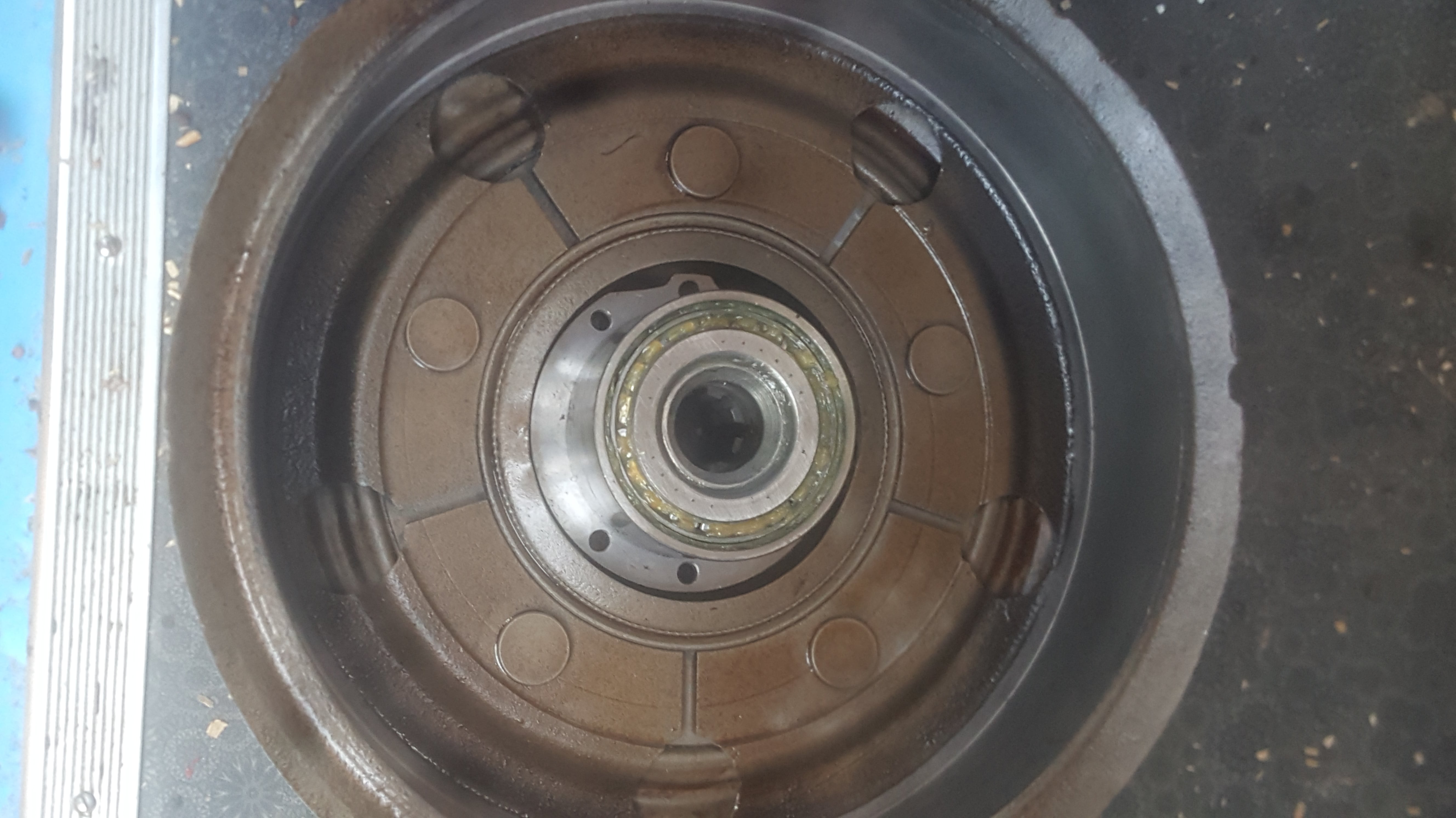 Zoals op onderstaande foto te zien is, was het lager helaas totaal kapot gereden. Inmiddels ben ik vanmiddag in het magazijn geweest. Daar bleek dat ook de trommel niet meer te redden was. Ik heb nu een gereviseerde trommel met lager (zie foto). Deze past echter (nog) niet. Moet ik dus die binnenste cilinder verwijderen en het overige gedeelte van het lager dat hier nog in zit? En zo ja, hoe doe je dat?