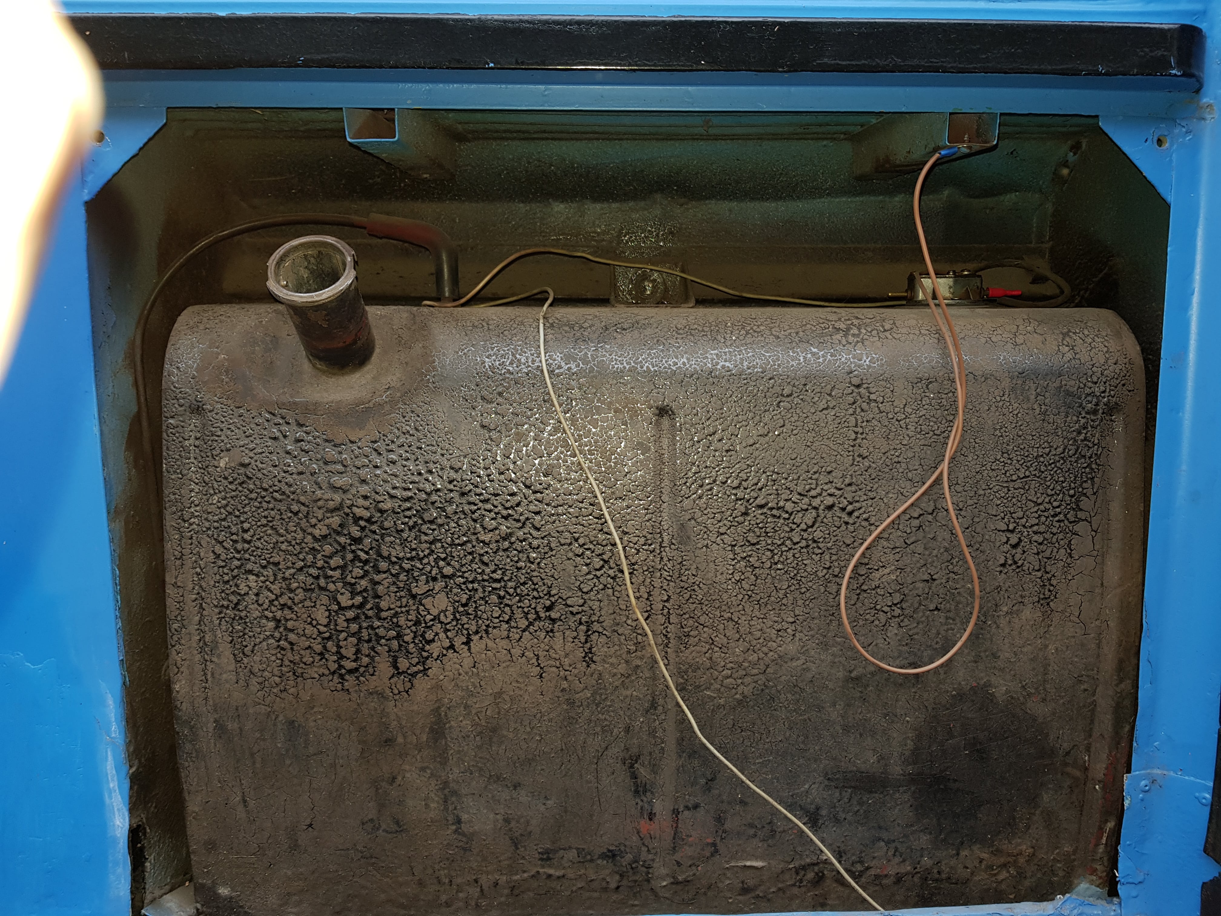 Heb de gehele holle ruimte en de tank met ijzerborstel op de boormachine geschuurd. De holle ruimte heb ik daarna met owatrol ingesmeerd en de tank met zwarte verf (aangelengd met owatrol) geverfd. Ziet er weer een stuk beter uit. Heeft er nog iemand tips voor de verdere behandeling? Er lijkt nauwelijks roest in de tank te zitten. Toch een antiroestbehandeling geven? En daarna de tank van binnen sealen? (fedox en/of tapox?)