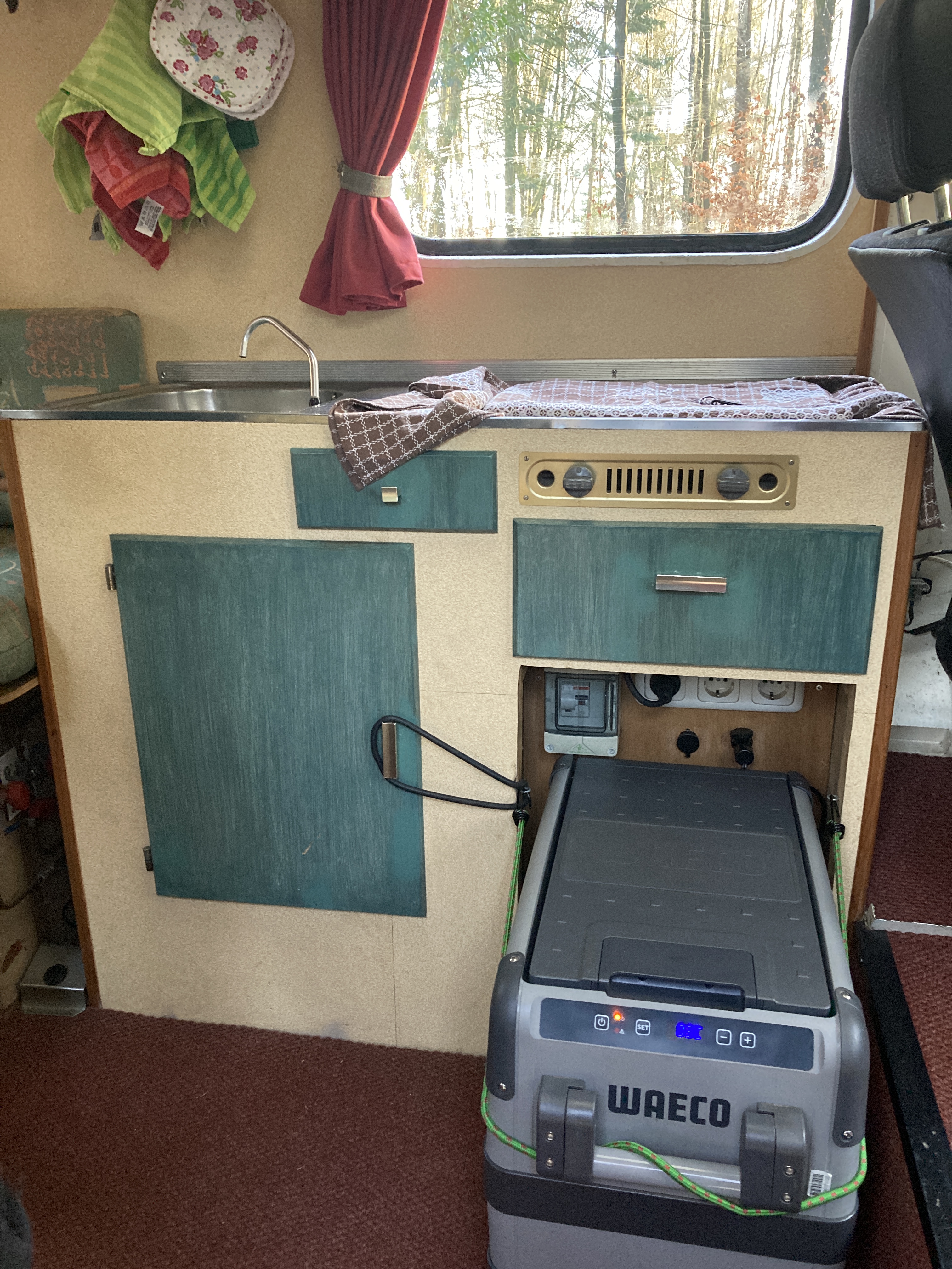 - Tweepits gaskookstel, elektrisch (voet)bediend waterpompje, watertank, losse afvalwatertank en gaskachel