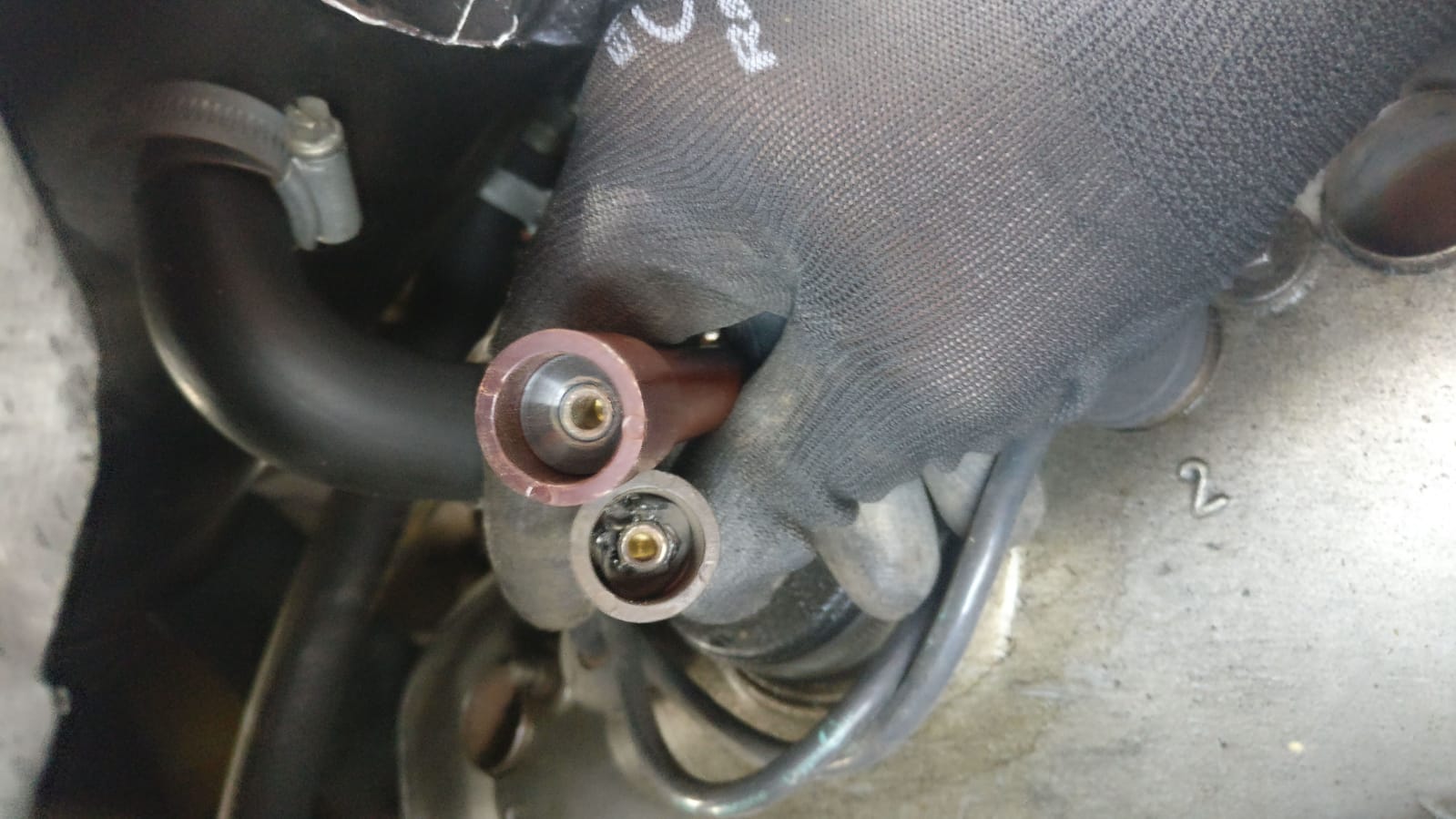 Voorste bougie was er uit geblazen... bougiekabel is ook wat beschadigd van binnen (dit zijn van die lange bruine, daar zit binnen in een soort blikken schoteltje, dat is stuk nu).