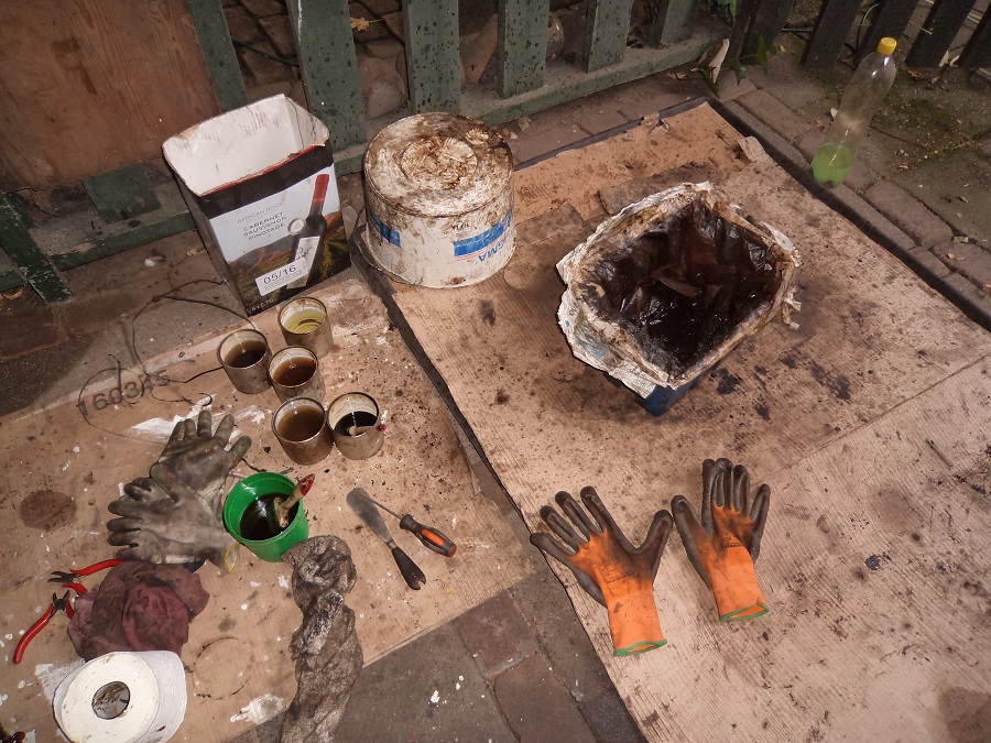 Oftewel: de bladblazer, tuinhark en bezem even terzijde gelegd, beide remtrommels met een paar handenvol gereedschap richting Otje verhuisd en de trommels geplaatst, de 6 boutjes erin en tenslotte de as-moeren met flink wat kilo's vastgezet.