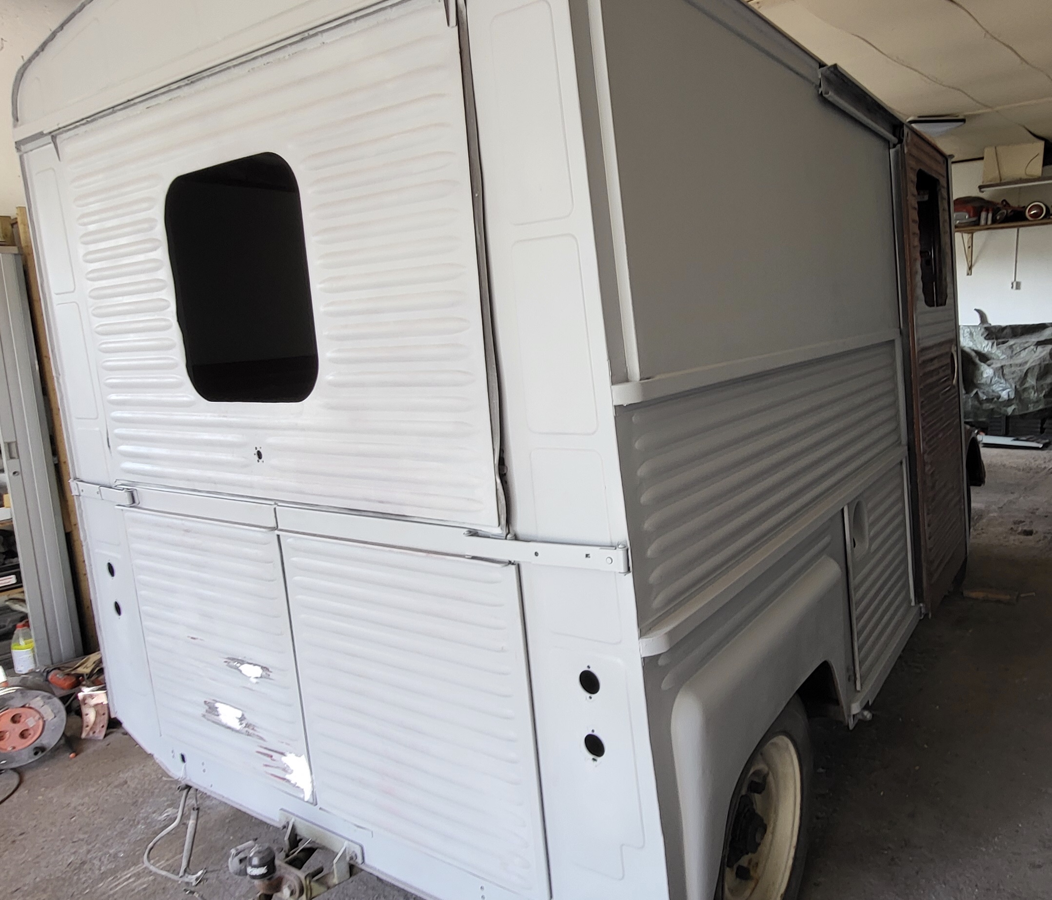 De slechte stukken zijn allemaal vervangen zoals, achterste kriksteun met het bovenliggende plaatwerk. Het bovenste omegaprofiel en de regengoot verwijderd. Achterspatbord uitgedeukt en een forse deuk op de de hoek tussen achterzijde en rechterzijkant uitgetrokken en gerepareerd.