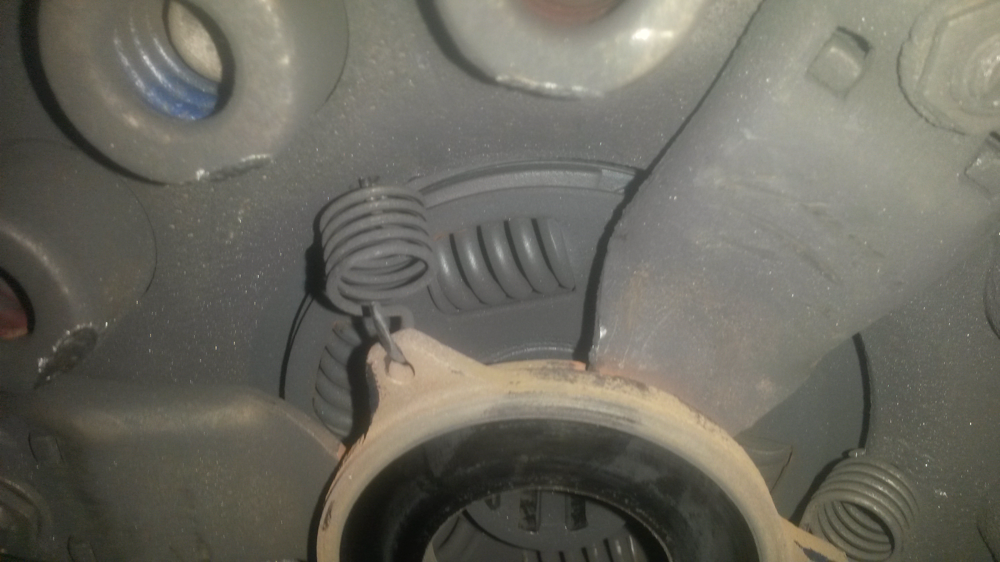 Ik kwam trouwens een van de 2 beugeltjes tegen (die het druklager vasthouden) op het balkje onder de versnellingsbak (zie foto's). Ik vraag mij af hoe dit kan zonder dat de motor van de versnellingsbak is ontkoppeld. Zit er ergens een ruimte naar buiten vanuit het koppelingshuis?