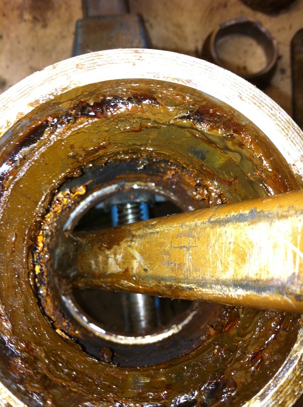 Toen het geheel los was, was wel duidelijk dat revisie echt nodig is. Voordat ik begon kon ik het huis niet om de as draaien zonder heel veel kracht, dat was ook al een indicatie dat er iets loos was.