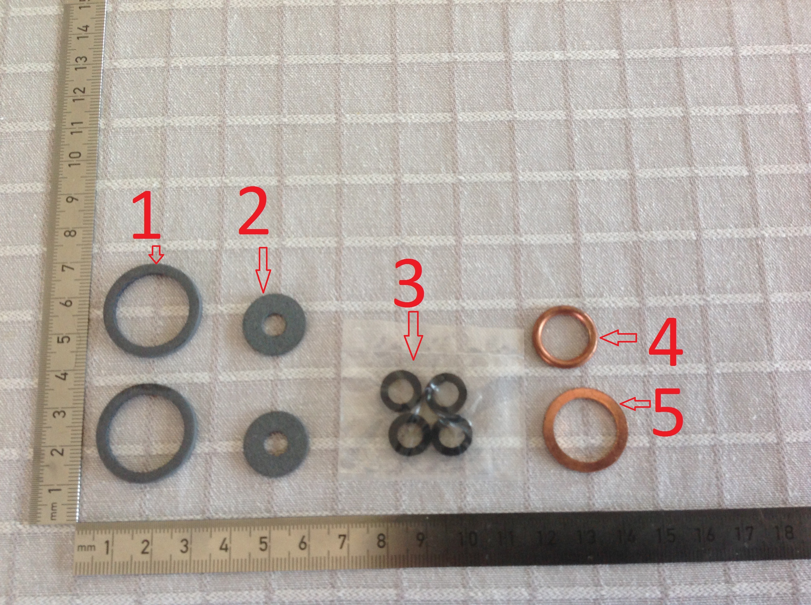 in de pakkingset die ik bij het magazijn kocht zoek ik nog naar de toepassing voor de dichtingen 1 en 2 op de foto.