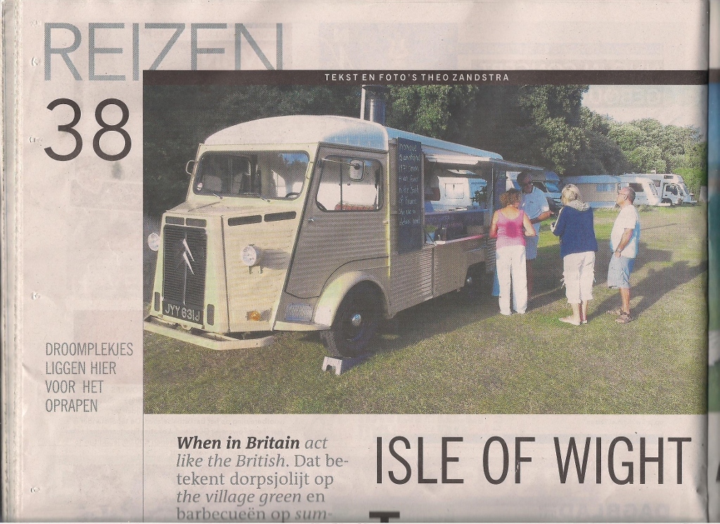 Wederom een leuk artikel in het Dagblad v/h Noorden van zaterdag16 augustus over deze "stokoude Citroën" welke is voorzien van een houtgestookte kleioven waarop de versgebakken pizza's bereid worden. Voorts veel informatie over het adembenemende Isle of Wight.