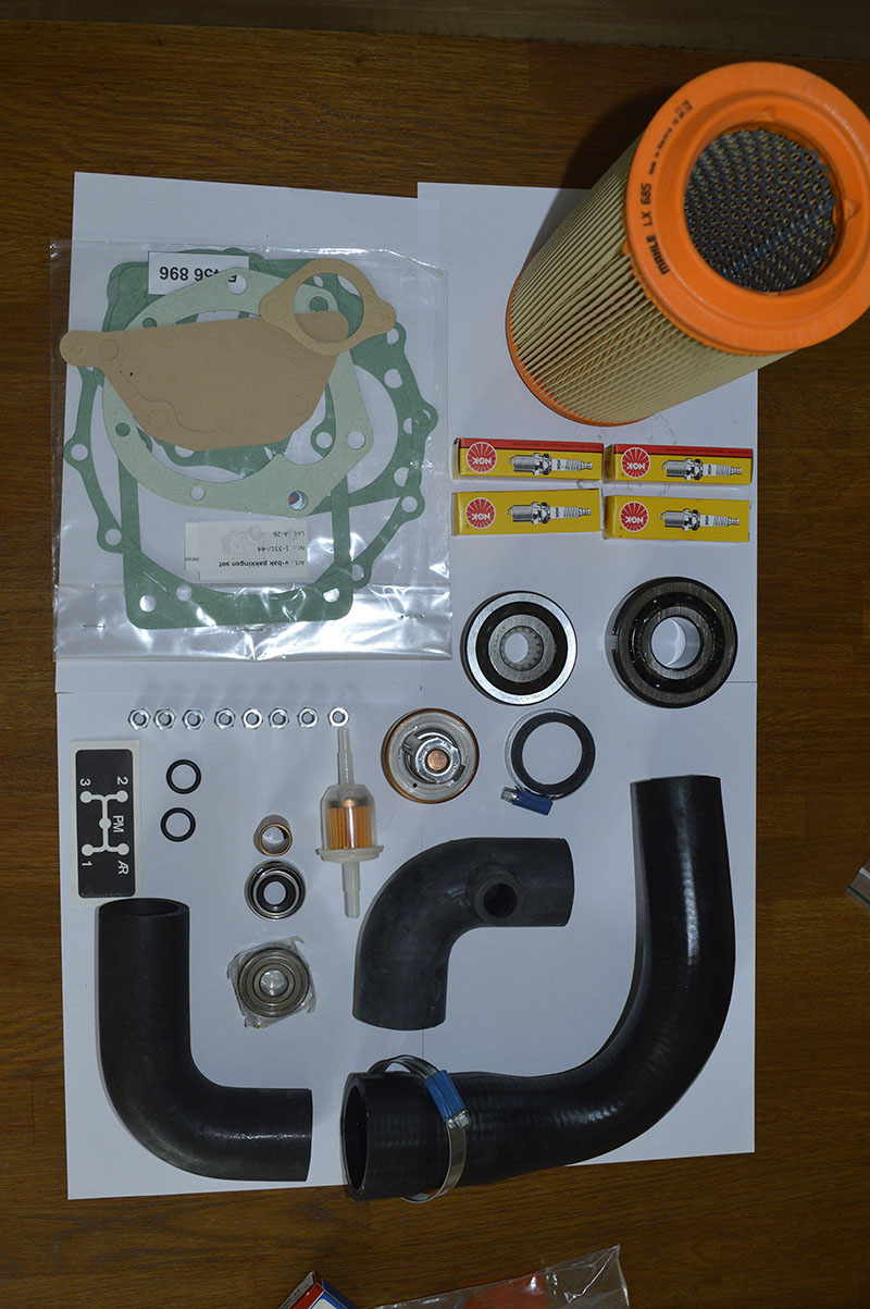 De waterpomp is gereviseerd. Oorzaak van het harde geruis van het bronzen lagertje was dat het olievulnippeltje geheel verstopt zat. Dus ook al ging hier af en toe een druppeltje in, het kwam niet bij het lager. Uiteindelijk beide lagers vervangen en de waterkering, nu de zaak toch open ligt. De opsluitmoer van het voorste kogellager zat erg vast. Hiervoor heb ik een speciale sleutel gemaakt. Tevens de waterslangen en de thermostaat vervangen, de bobine schoongemaakt en geverfd (kon ik nu gemakkelijk bij). Tenslotte de radiateur hier en daar wat ontroest en in de (blanke) tectyl gezet.