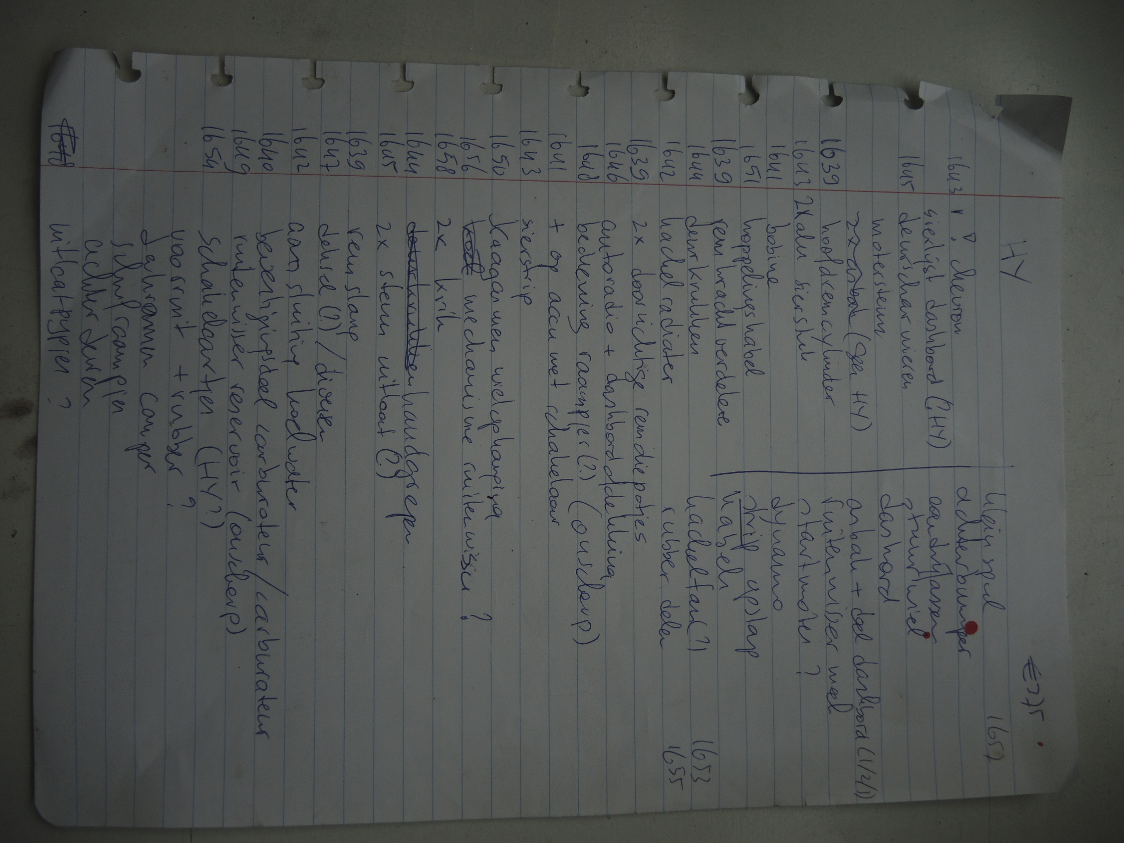 Als bijlage een klad papiertje met wat het allemaal is, alleen de startmotor wil zelf houden. De achterbumper is een voorbumper.