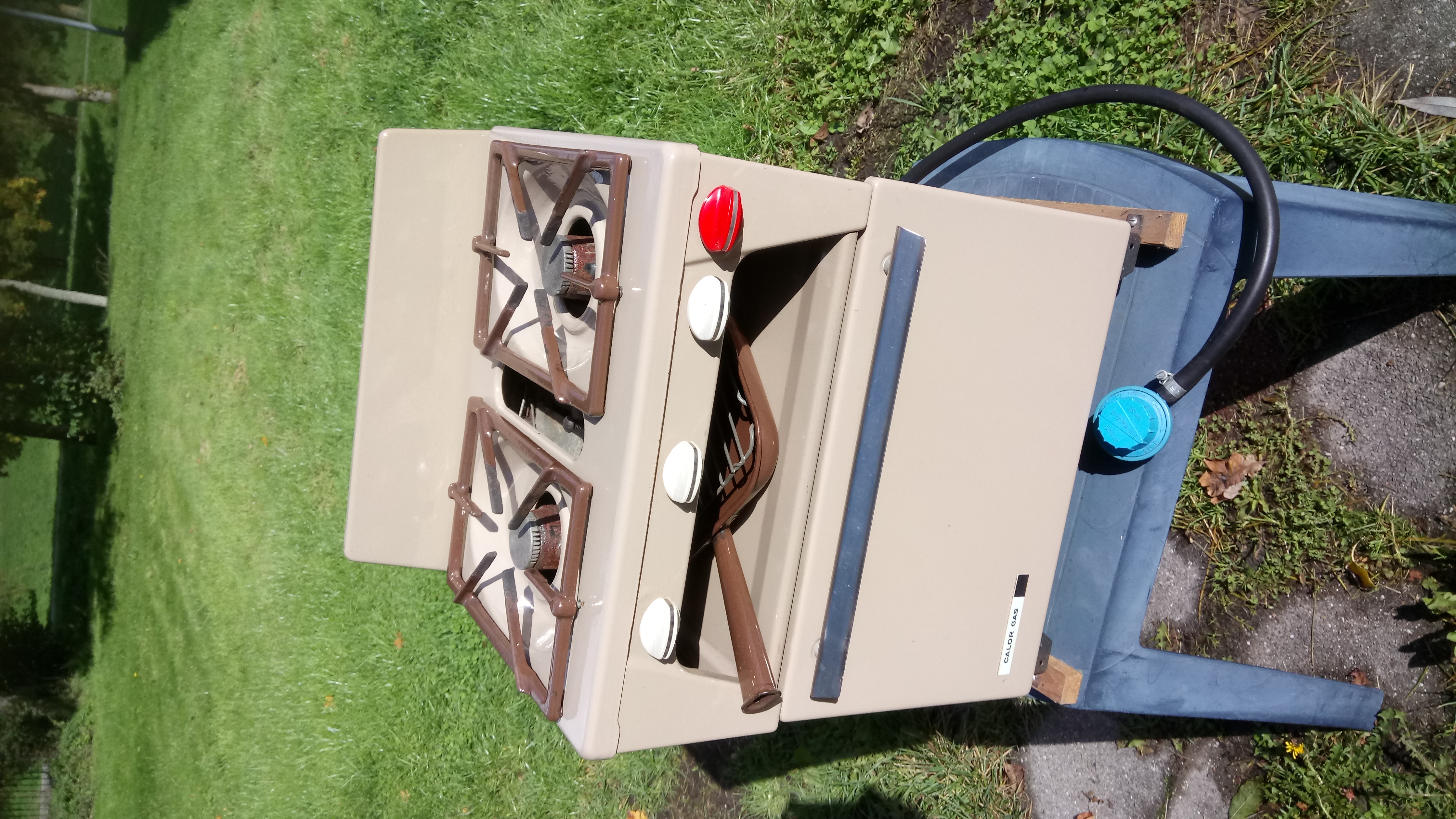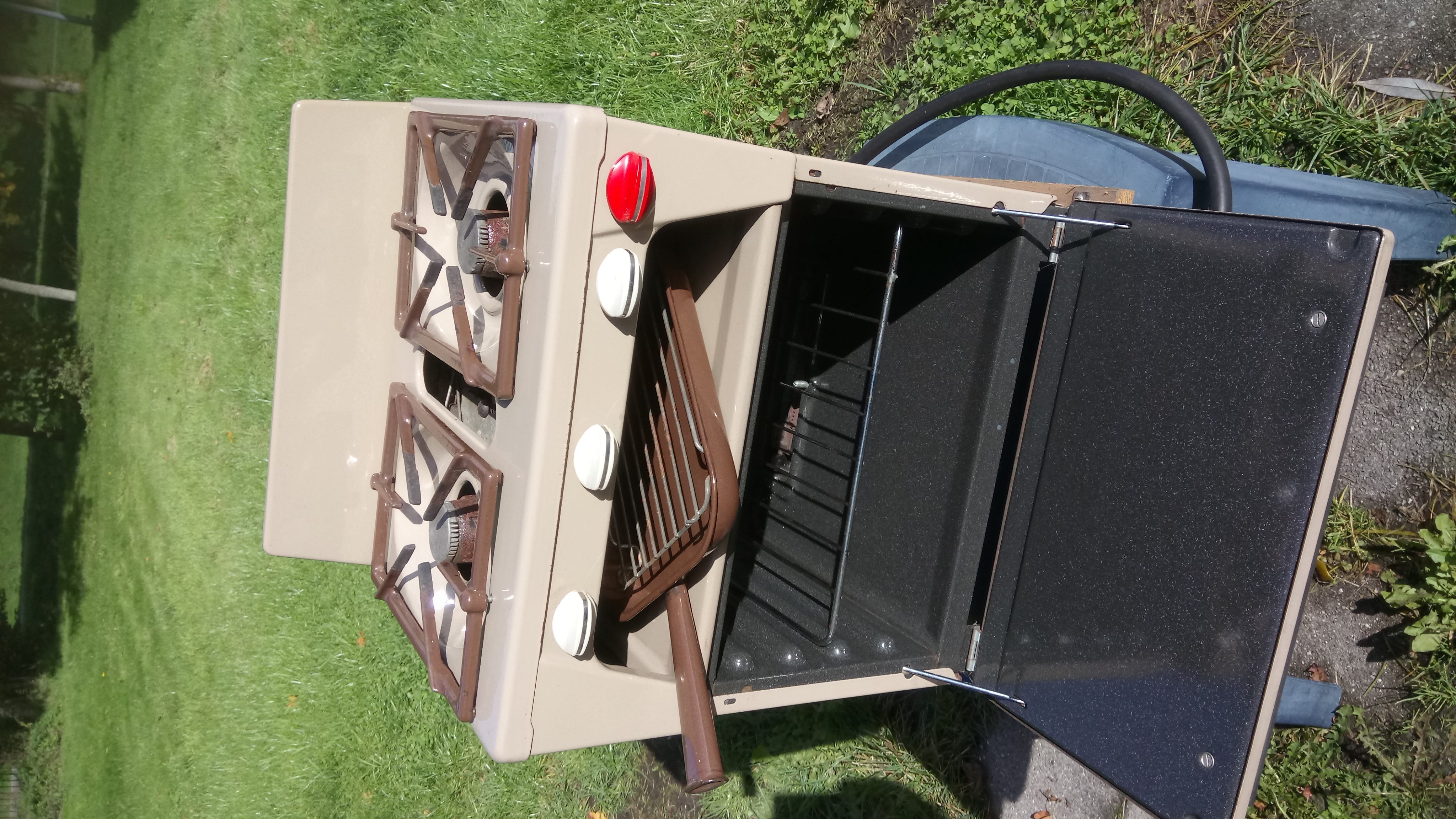 Twee kookpitten en een oventje geschikt voor flessegas. Kleur beige. Afmetingen 43,5 x 42 x 56,5 cm (bxdxh). Die blauwe drukregelaar die je op de foto ziet is oud en stuk dus die moet je even vervangen door eentje die op de gasfles past die je gebruikt. Je kunt hem ook inbouwen in de keuken van je bus. Ik kan hem voor je meenemen naar de HY meeting van Camion in Appeltern. Of afhalen bij mij thuis in de buurt van Alkmaar. Vraagprijs is 85 euro.