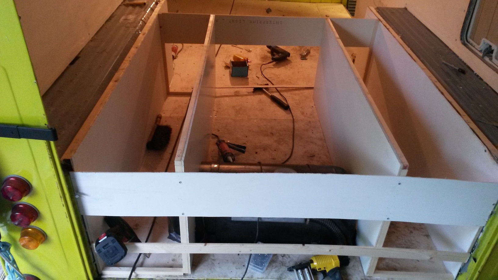 Hierna de zithoek achter de voorstoelen gemaakt. De bedoeling is dat de jongste 2 van het gezin daar veilig kunnen zitten in de gordels. Hiervoor wel als onderstel een stalen frame gelast die door de bodem heen vastgezet is. De vorige opstelling was in rijrichting maar omdat dit erg veel loopruimte koste toch maar besloten om dwars op de rijrichting het zitje te maken, onder de bank gelijk een plek voor de wc :wink: