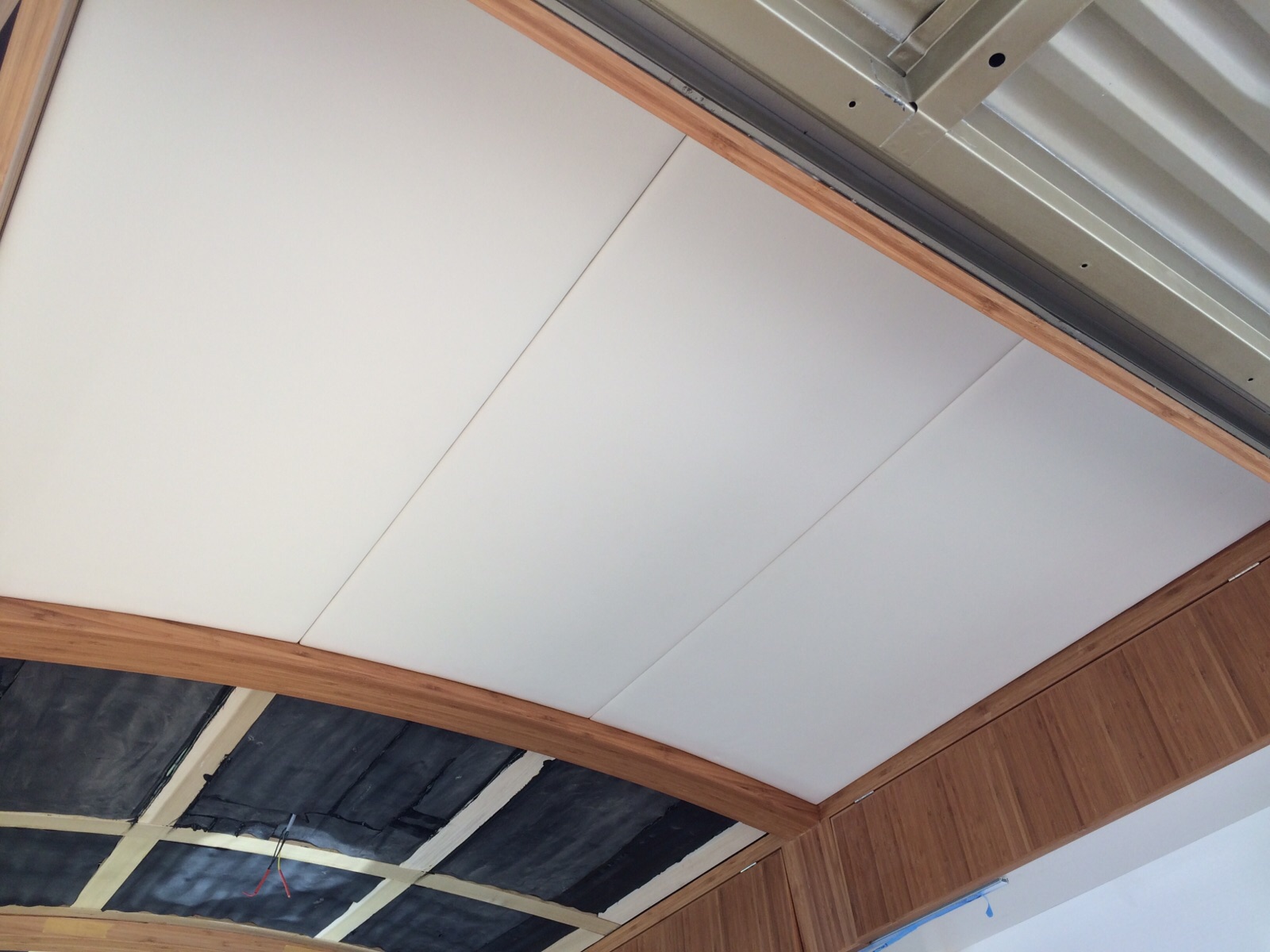 bekleding wordt volgende week ingemeten, de tv is onzichtbaar ingebouwd inmiddels evenals de dolby surround... Let op de geweldige oplossing voor de speaker roostertjes.......... in rvs
