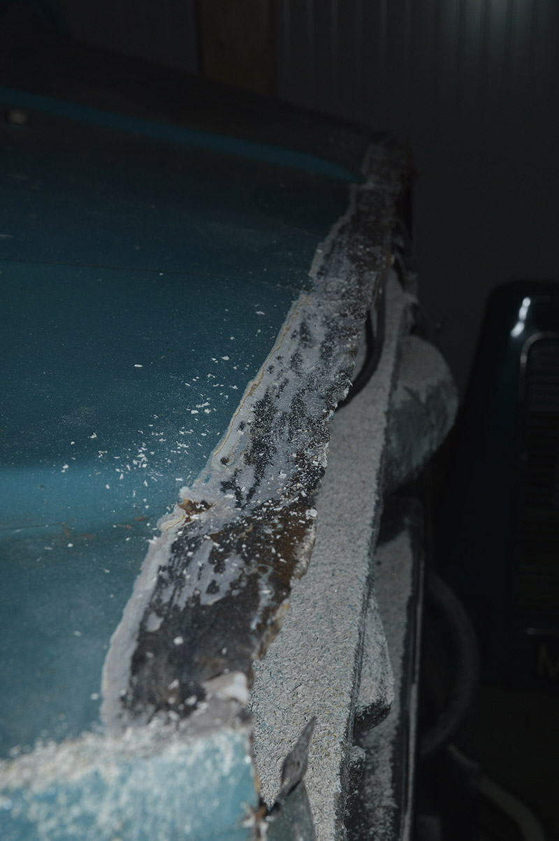 Ik had al gemeld dat ik lekkage had in de schuifla in het dashboard. meest voor de hand liggende oorzaak leek toch wel de voorruit. Vandaag heb ik deze verwijderd. Dat ging gemakkelijker dan ik had gedacht en hier en daar had gelezen. Vanaf de bovenhoeken het raamrubber loswerken en achter het frame werken met een stompe schroevendraaier, richting het midden. Zo ook vanaf de hoeken naar beneden en dan kun je het raam er zo uitnemen. Met name de onderkant van het carrosseriedeel is aardig aangetast. Zie foto. Daar ga ik het een en ander wegslijpen en nieuwe stukken inlassen.
