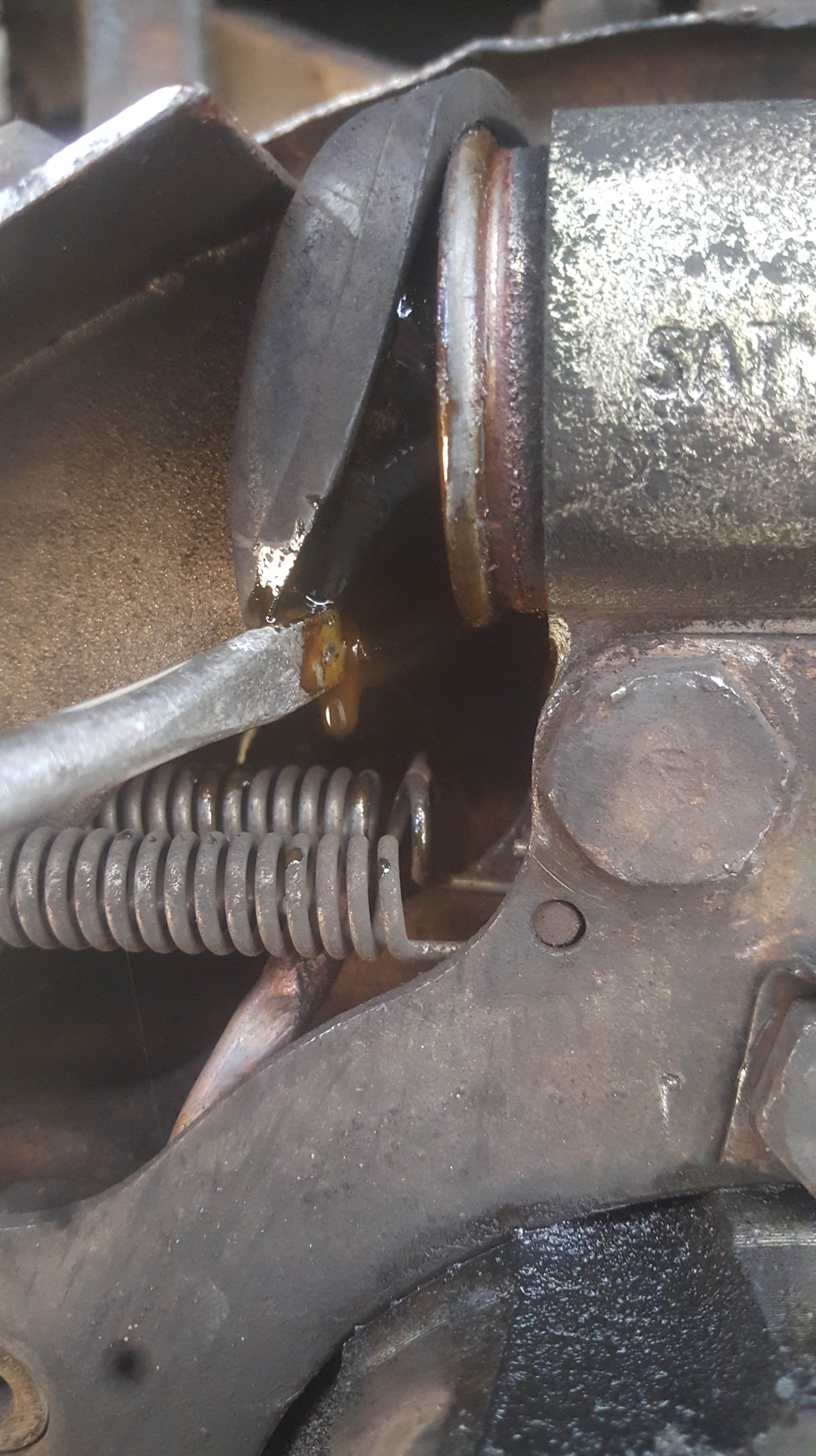 Overigens lekte de bovencilinder van de rechtervoorrem (zie foto's). Bij het optillen van de cup lekte er enkele druppels bruine drab uit (anders niet zichtbaar). Die cilinder zit er pas 10 maanden op. Dat mag toch niet gebeuren? Kan ik hiermee terug gaan naar het magazijn? De rechtervoorrem bleek overigens ook veruit het slechtste te remmen. De marge bleef net binnen de 30 procent.