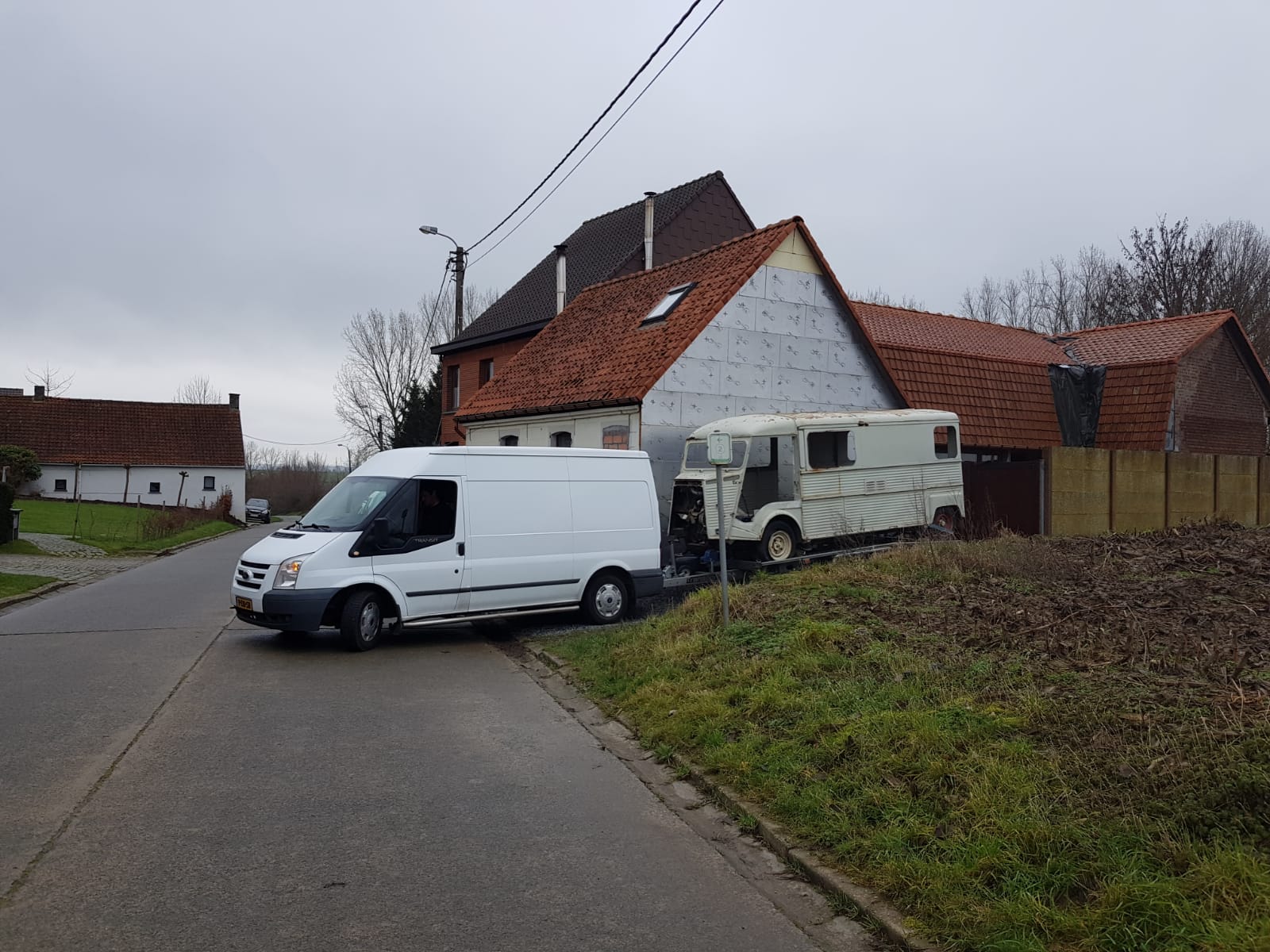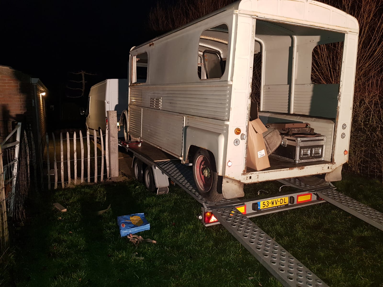 De verkoper heeft de bus op de wielen gezet om op te lieren, maar het beloofde gangbaar maken was minder goed gelukt. Met 1 vast en 1 zeer zwaar lopend wiel toch op de autotrailer gekregen met behulp van 2 lieren.