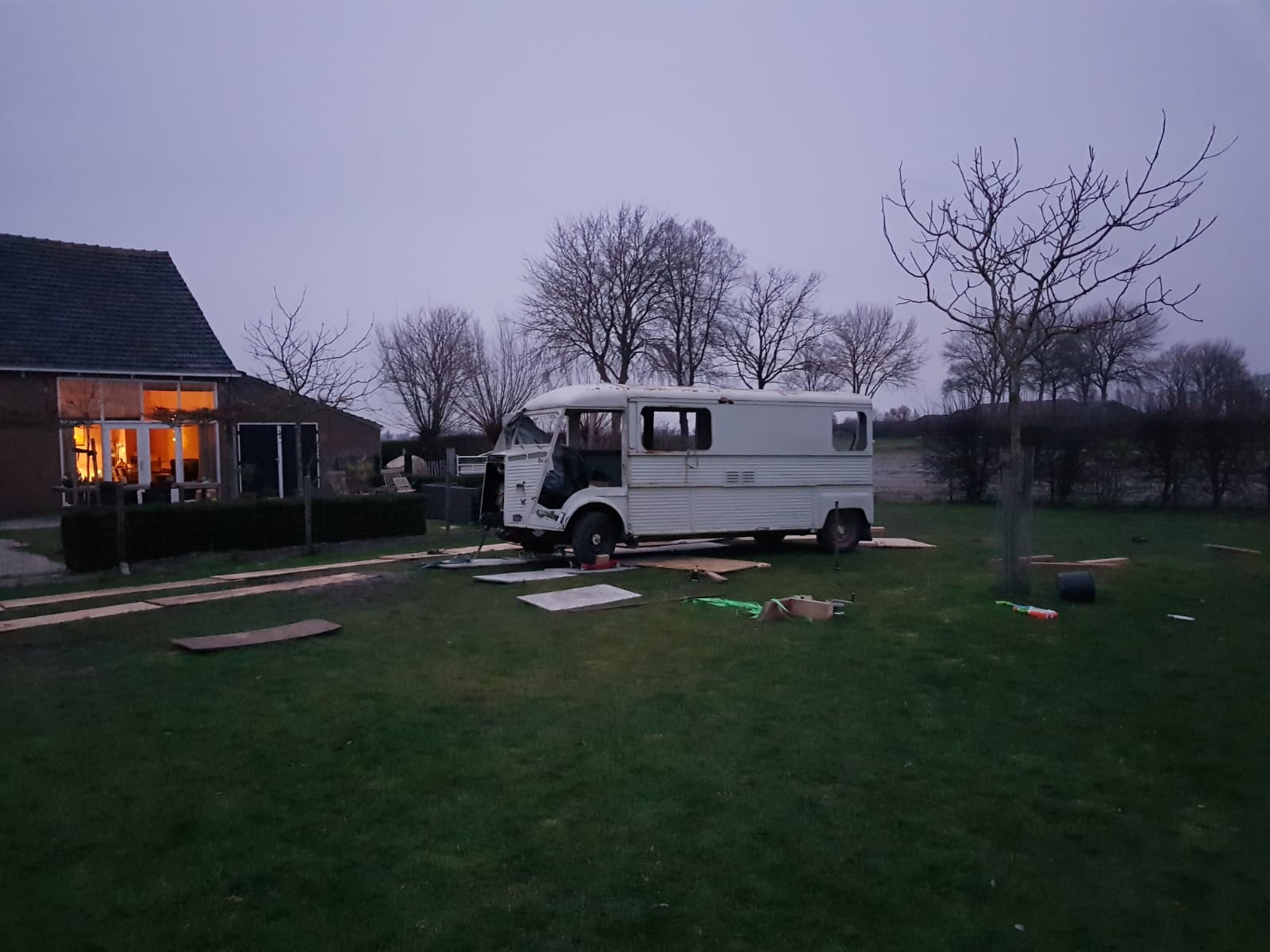 Eenmaal gaan kijken trof ik de bus gescheiden van het paard en zonder achterwielen op blokken onder het chassis naast het huis onder een zeil.