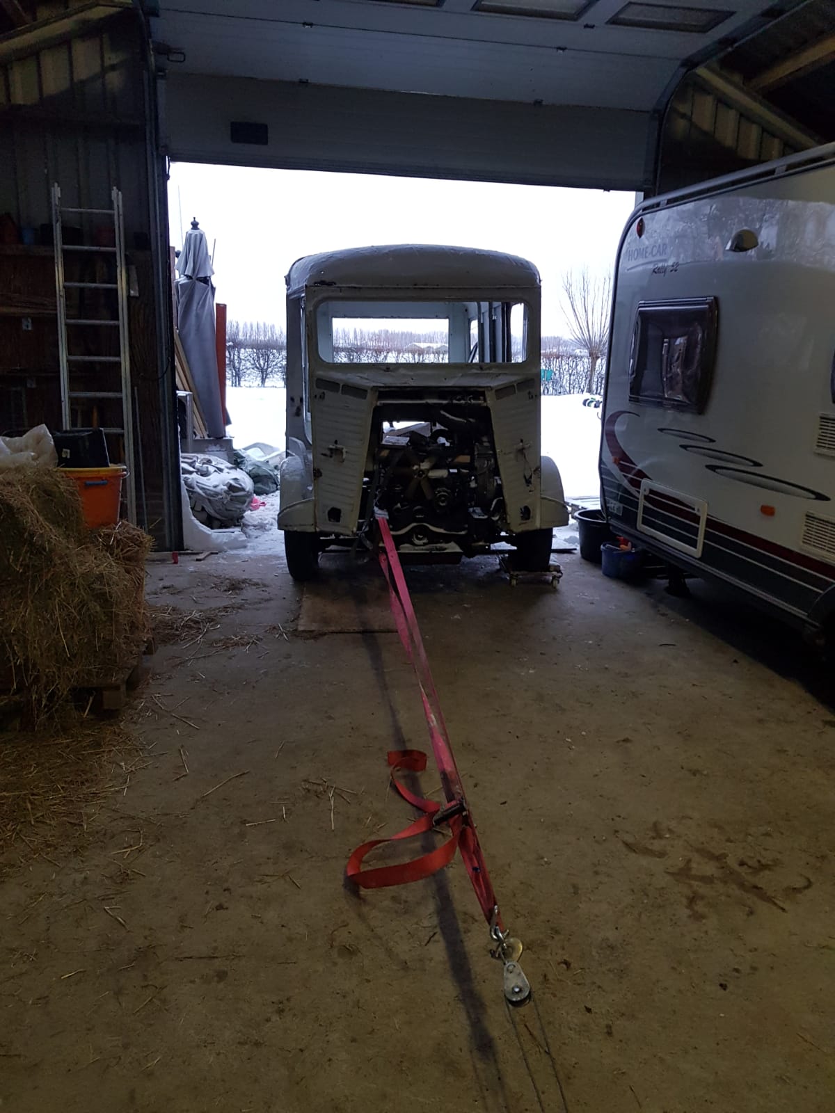 Inmiddels staat hij binnen op de brug waar hij maar net op past. Verbazingwekkend genoeg heb ik van het linkervoorwiel dat vast stond inmiddels de trommel eraf waar rechtsvoor (degene die nog minimaal liep) de trommel er niet af te krijgen is met de slagtrekker...