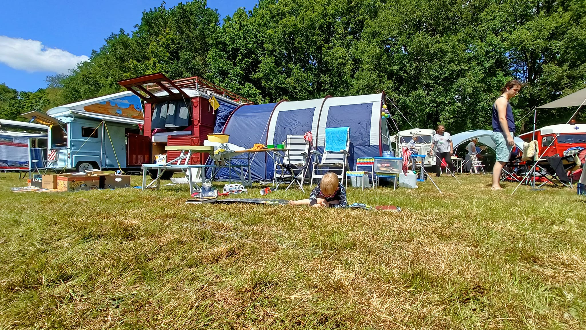 Onze heeft een binnentent, waar onze meiden in slapen en dan is er plek voor campingbedje van de jongste en dan nog genoeg plek voor koelkastje, tafeltje met kooktoestel en kratten met spullen.