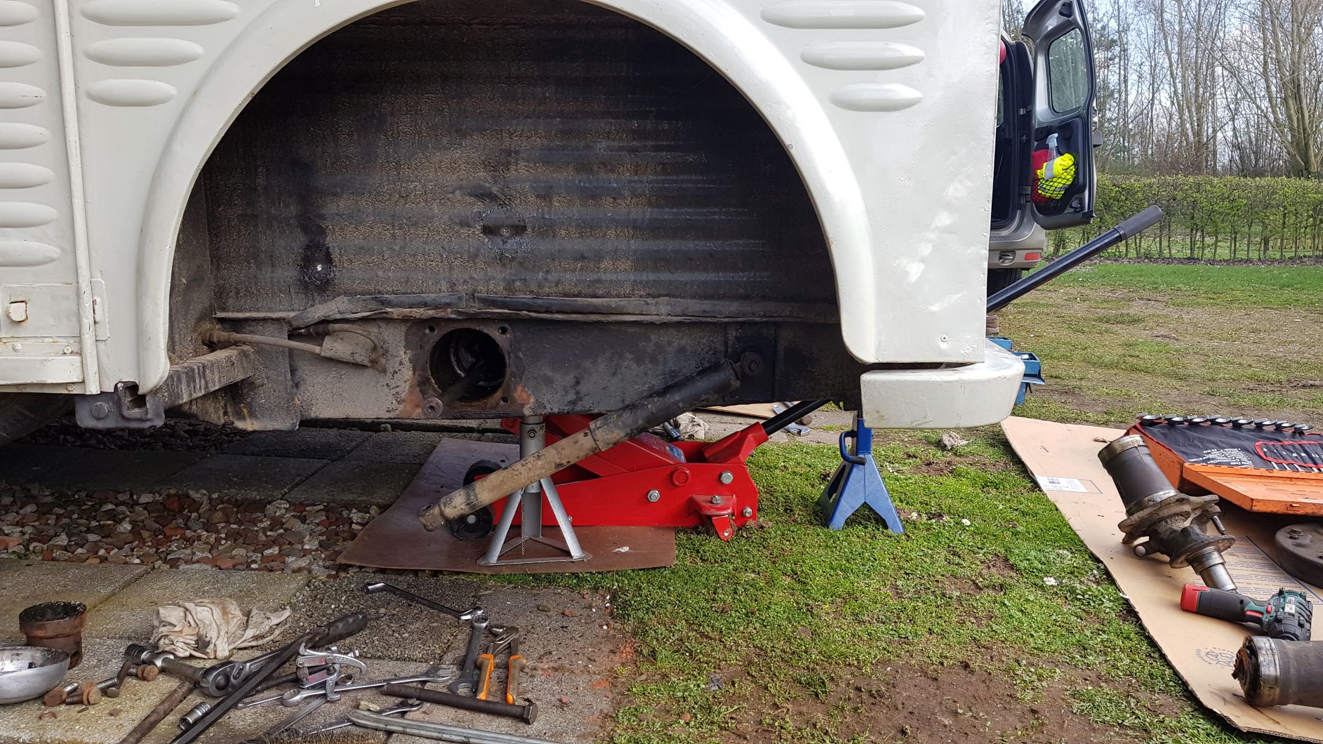Wat ook heel erg hielp maar niet praktisch was: een loodmat oorspronkelijk van Noise Killer voor Landrovers. Dit is letterlijk een lap lood in een hittebestendige stoffen hoes. Alleen bij een Landrover leg je 'm boven op de motor, bij een HY moet je 'm er omheen vouwen en op een gegeven moment heb je een zak met allemaal stukjes lood er in.