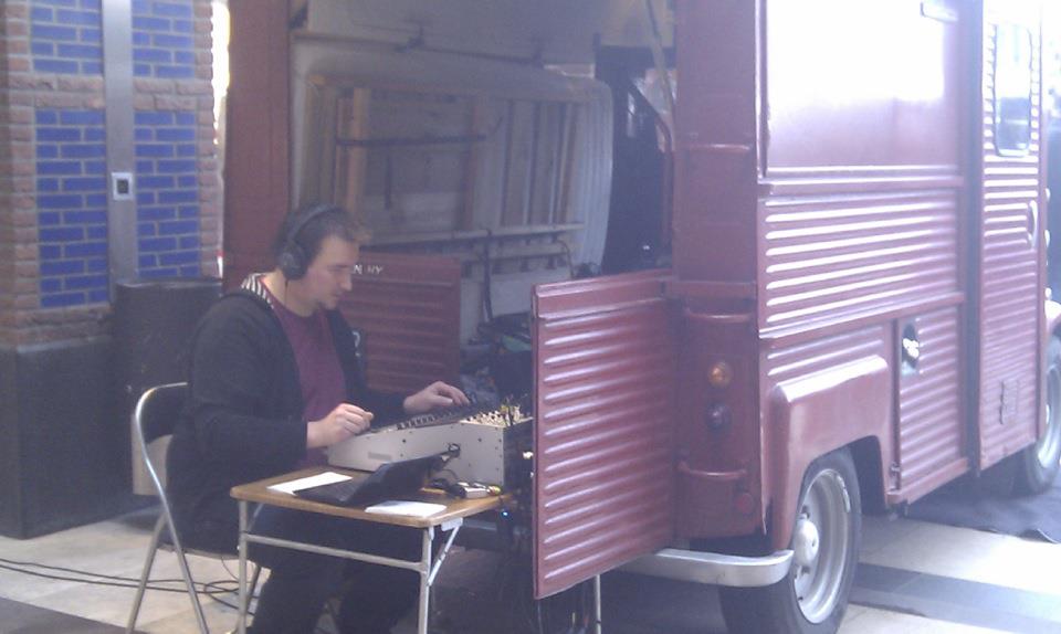 Sinds kort hebben wij namelijk onze eigen audioinstallatie, bestaande uit grote subwoofers en daarboven op flinke luidsprekers, een stel statieven, microfoons en heel veel kabels. En dan nog een set krukjes en nog wat anders spul dat je zoals mee sleept
