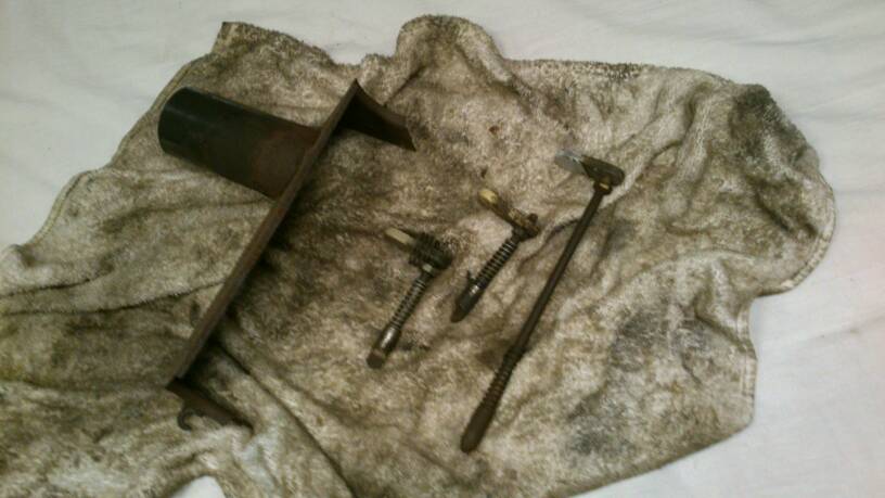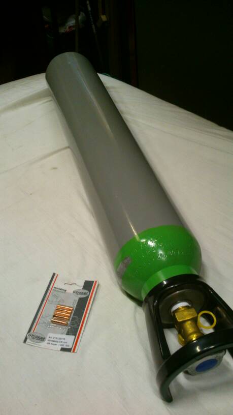 Daarnaast voor ik naar Heesch ging nog even langs Rustbuster geweest en m'n 2 liter fles ingeruild voor een 10 liter (die je tenminste overal kan laten vullen). Tevens wat tips gekregen om m'n Iskavar te onderhouden want de draaddoorvoer werkt niet meer zo goed: punt vervangen (zie nieuwe pakje op de foto), wieltjes schoonmaken en slang smeren en dan zou het weer perfect moeten werken. En een nieuwe veer voor in de toorts meegekregen.