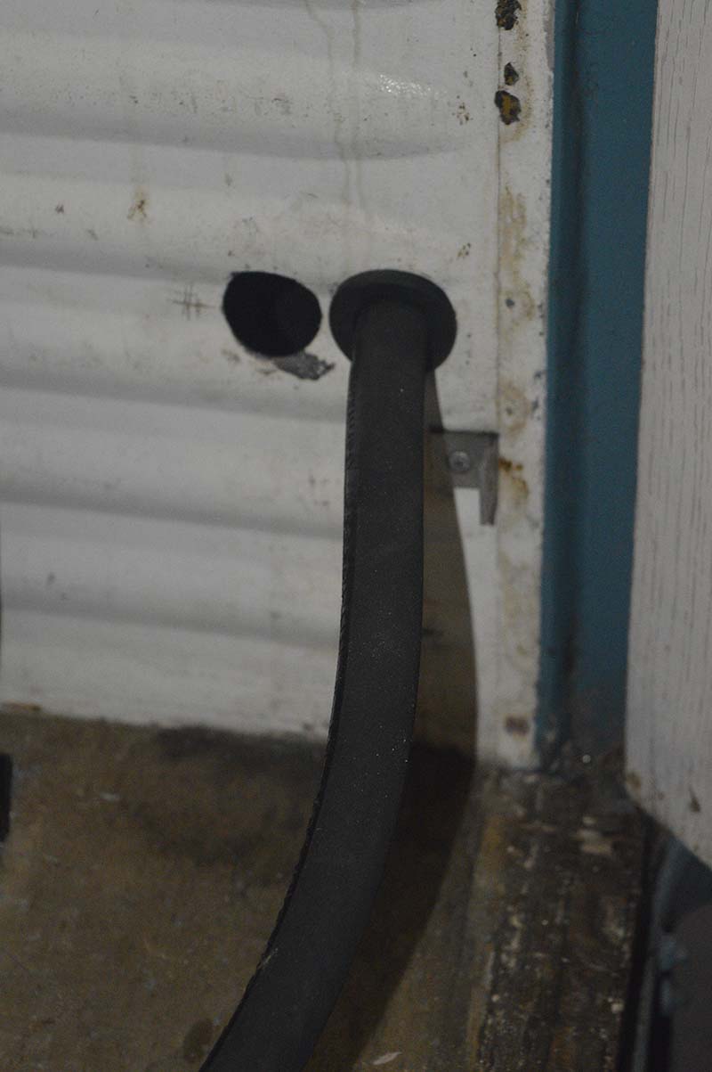 Doorvoer vulslang naar rechter wielkast en de doorvoer van de LPG-leiding naar de verdamper. Op de plaats waar de remleiding en de benzineslang door de dwarsbalk gaan, is nog plaats voor de LPG-leiding.