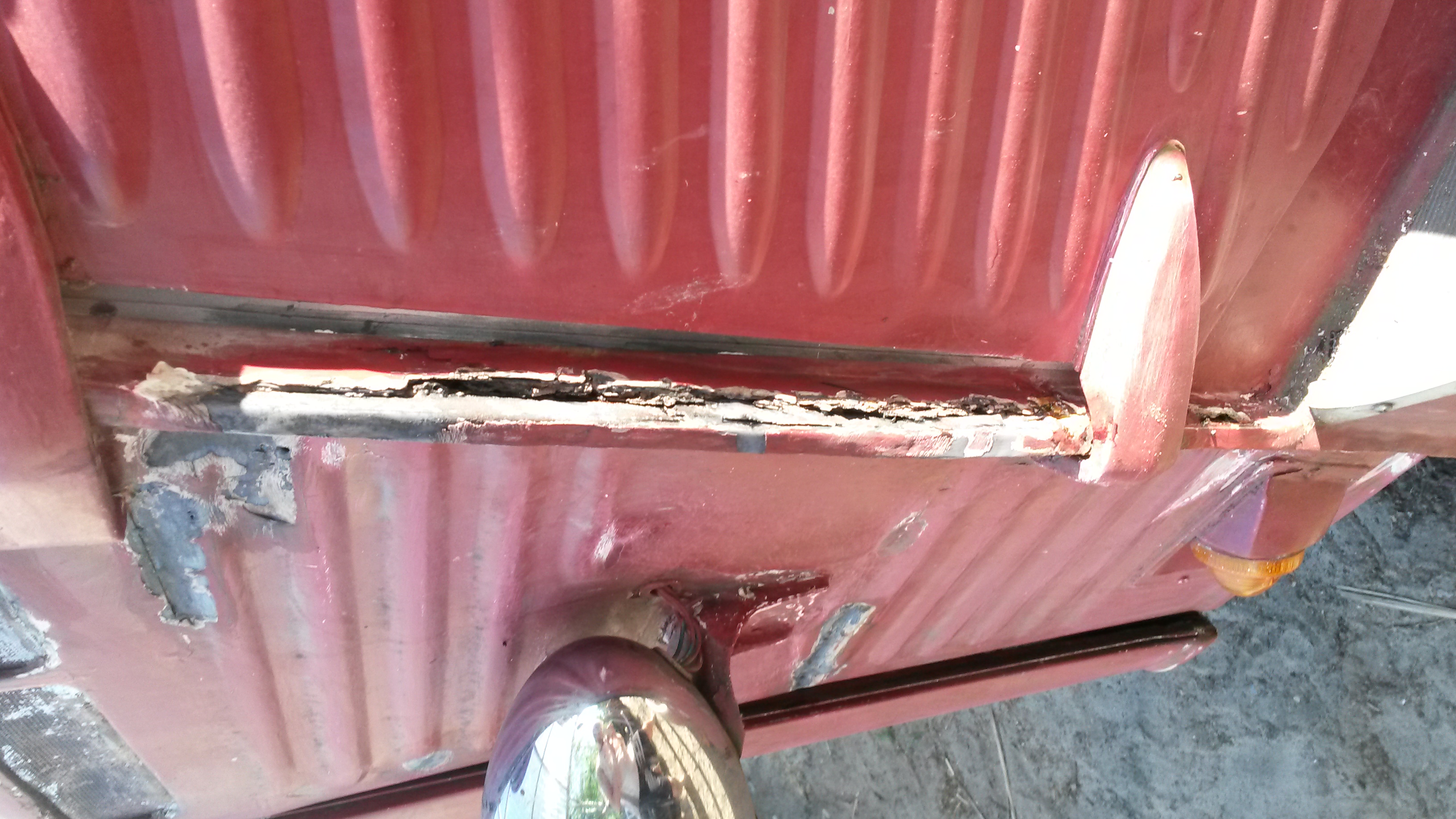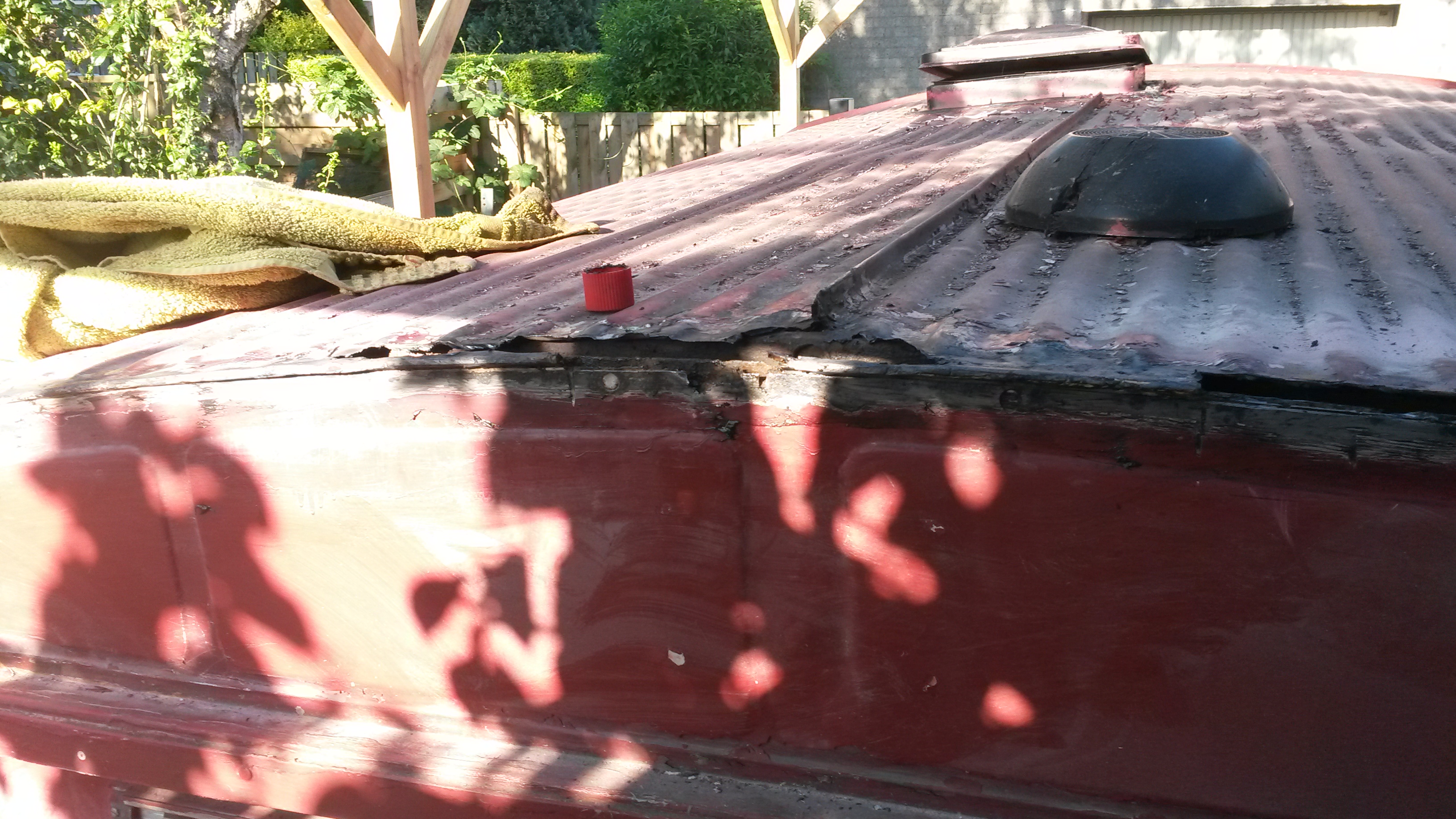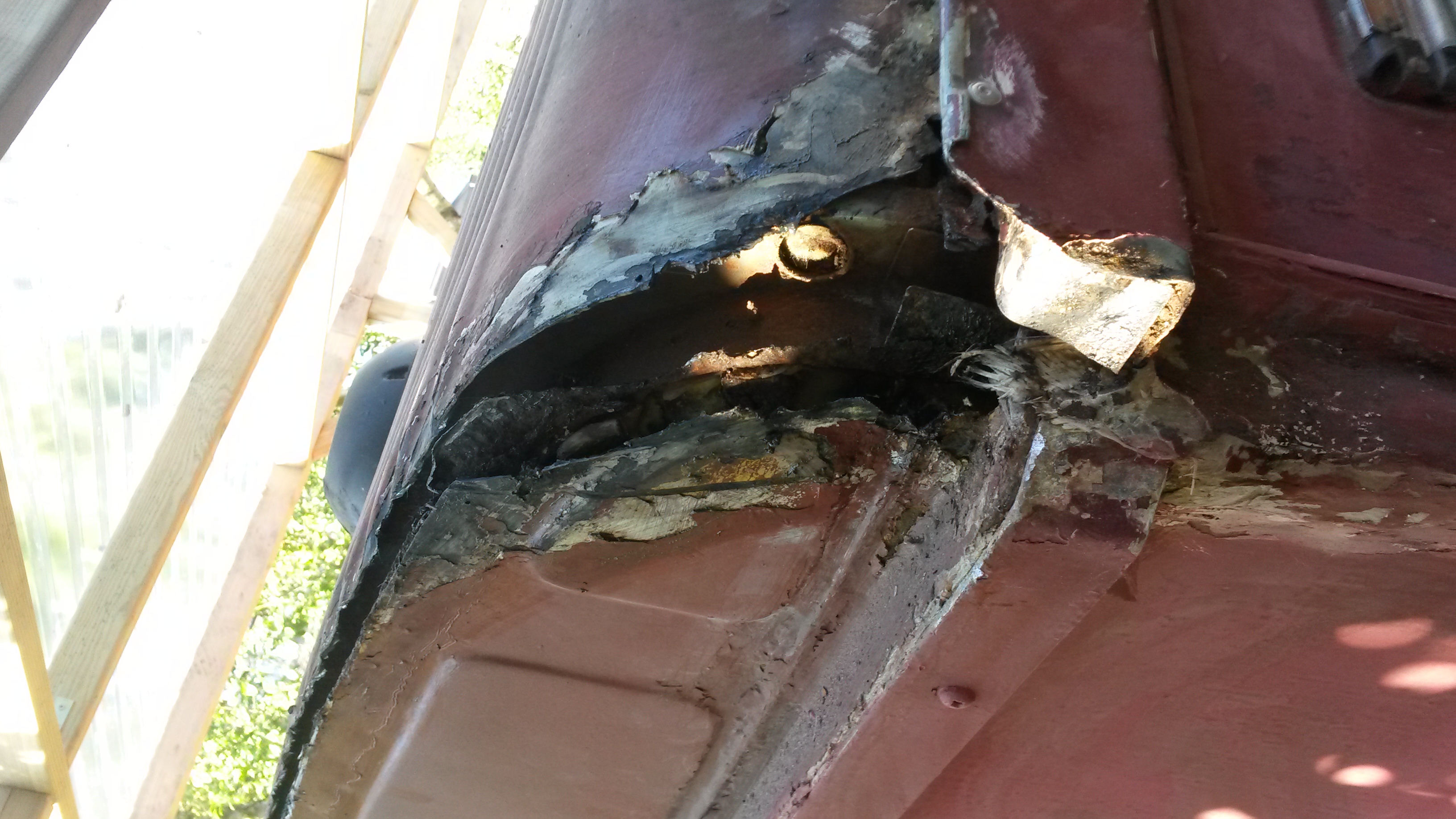 Nadat onze HY vorige maand een nieuwe motor heeft gekregen zijn we nu begonnen met een grote schuurbeurt onder het motto: liever nu grondig werk dan over een jaar of 2 wéér overal roestplekken. Het was nodig ook. Tussen een van de voordeuren en de voorruit is een groot deel compleet weggerot. Ook bij de dakhoeken is de bus zeer slecht. Achterop het dak heb ik een hele sleuf weg moeten slijpen. Was ook totaal rot. Dat verklaard dat binnen de kastjes krom begonnen te trekken.